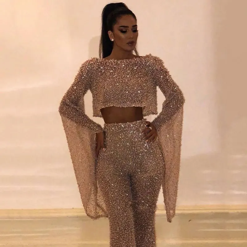 Mono Sexy de manga larga con campana y espalda descubierta para mujer, traje de dos piezas falso de lujo, Top ajustado, pantalones y pantalón para fiesta en Club